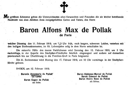 Le Baron est mort à Baden (Autriche) le 11 février 1919. Il y a été enterré. Beaucoup de barons